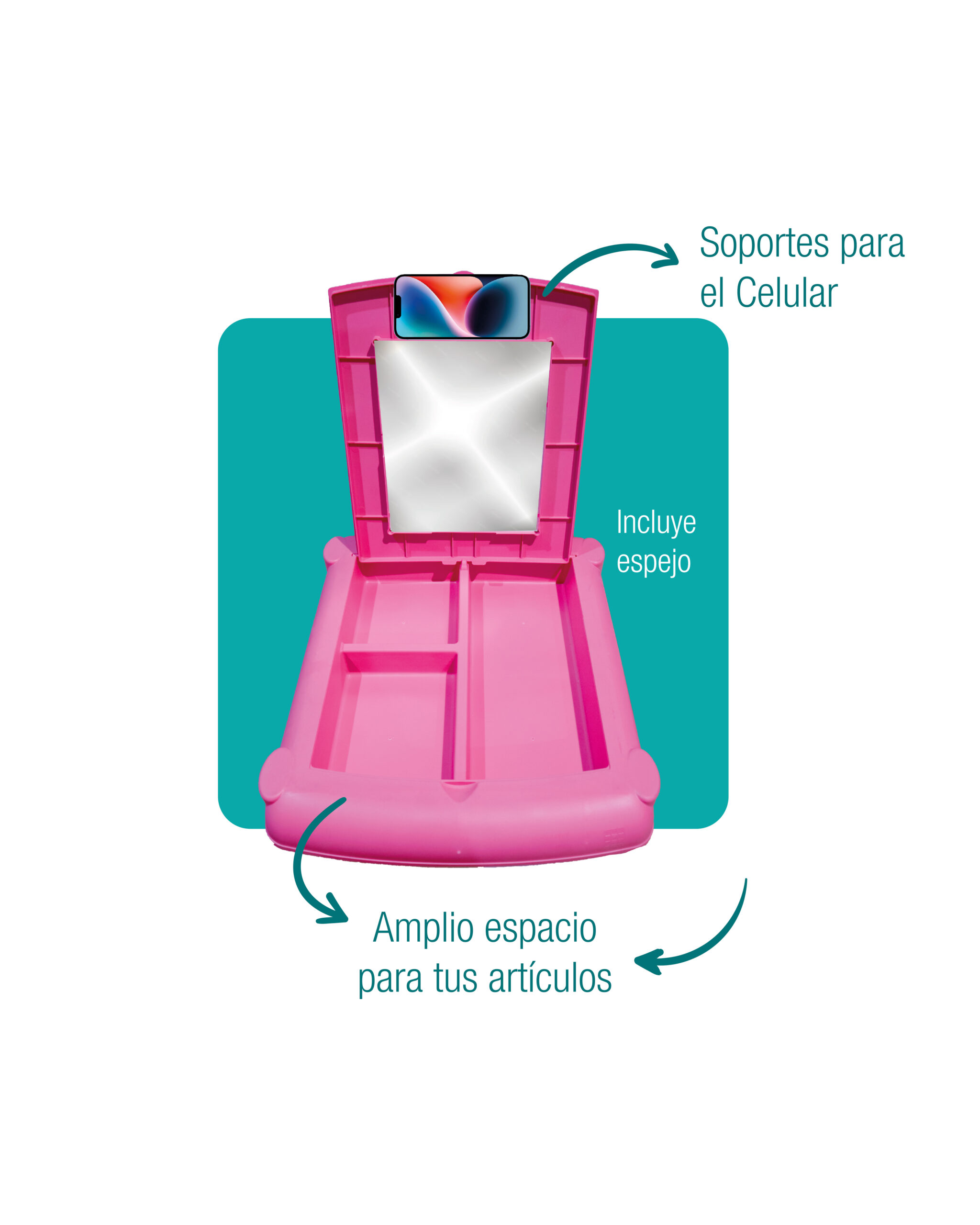 El mueble organizador con espejo superior es ideal para maquillaje o peinados, ya que puedes guardar tus cosas en los cajones inferiores y hacer de este un tocador todas tus mañanas. El estilo rosa viene con base rosa y cajones aguamarina y rosa.